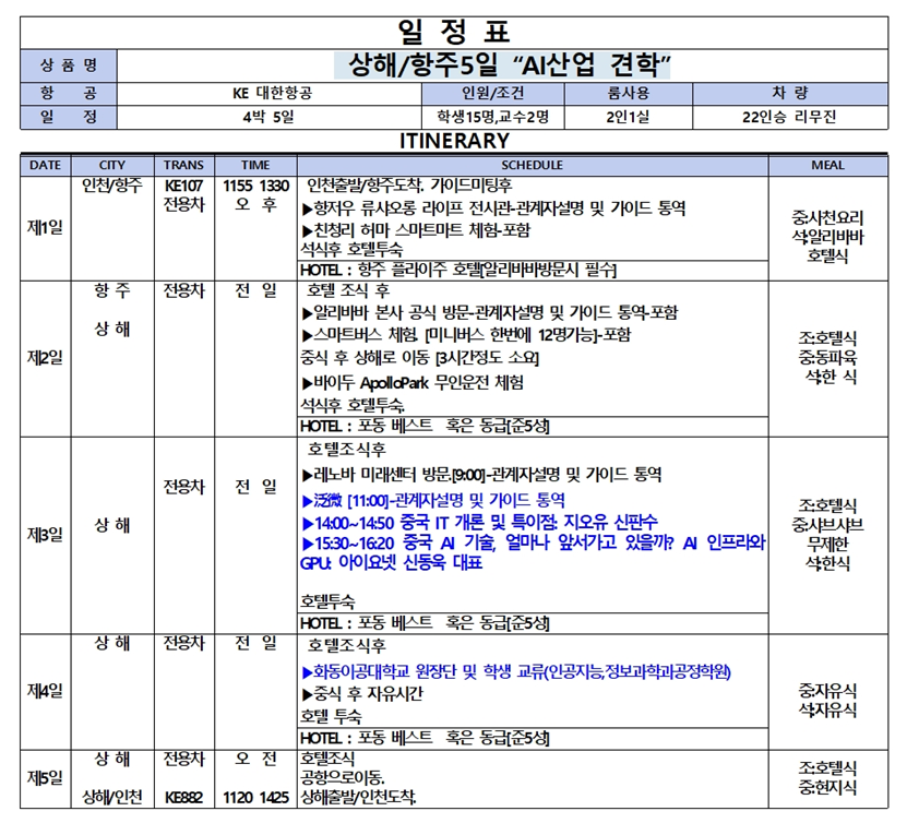 중국상하이 글로벌 인턴쉽 상하이 비즈니스 인턴쉽,취업연수,기업탐방프로그램,한중교류세미나 중국 상해인턴십 프로그램은 중국에 진출해 있는 한인 업체에서 실습을 진행하며 실무에 바로 투입될 수 있는 경험과능력을 배양하는 프로그램으로써중국의 문화, 환경, 법규 등 중국 경제 사회 활동을 배우고 이해함으로써 세계 최대 시장인 중국에 대한 지역 전문가를 양성하는 프로그램입니다.매 년 상반기 하반기 15개 대학의 약 100여명 학생이 4주 교육 후 상해현지기업체로 12주간 인턴으로 채용되어 실무경험과 능력을 배양하며중국지역전문가양성을 위해 최선을 다하고 있습니다.더 나아가 이 시대의 많은 젊은이들이 이 프로그램을 통해 통찰력 있는 세계관을 확립하여 진취적인 이상을 품고 보다 나은 세계화의 선두그룹의 일원으로 일임하게 되길 희망합니다 ✝ 인턴쉽 취지 -풍부한 인력과 자원으로 획기적이고 개방적인 국가경영 → 급속도의 경제 발전-세계 1위의 경제 대국으로 성장 예측 (2025년 미국 향후 정세보고서)-중국적인 경영 노하우와 능력을 갖춘 국내 기업인의 양성 → 국가적인 과제-중국내 한인 기업은 저렴한 인건비의 생산 근로직 확보에 비해 고급 인력에 속하는 사무직, 연구직,전문직 확보가 어려운 실정-중국 인턴십 = 거대한 중국의 출현에 대비하는 의미 있는 정책-고학력 청년 실업자 문제 해결 + 중국 현지 한인 기업의 고급 인력 확보 ✝ 상해인턴쉽 -연수기간 : (총16주) 어학교육 4주(선택사항)+상해인턴쉽 12주(조정가능)-연수대상 : 만 20세이상 ~ 30세미만의 해외취업을 준비하는 성인남녀(재학생,졸업생,예비졸업생)-어학교육기간 : (오전수업)주 5일, 1일 오전수업 (4 교시) – 오전9시~12시-어학교육장소 : 상해 소재 대학교 국제교육학원-인턴쉽기간( : 오전,오후근무) 주5일 , 오전9시~6시까지 보통 근무-근무장소 : 중국상해에 진출해 있는 한국기업 및 외국기업-숙사조건 : 호텔식 기본 2인1실 (1인/일/75원)-개별화장실, 욕실, TV, 전화,에어컨,옷장,책상,냉장고, 인터넷무료-저렴하고 안전한 호텔식 교내숙사를 이용할 수 있습니다. ✝ 배정기업 상해 내 기업체 (상해한국상회 정식등록 된 업체만 가능)<정부 기관 및 협회>-상해한국상회(한국인회)-대한민국 주상하이 총영사관-한국무역협회 상하이 지부-상해한국문화원-경기도 상하이 대표처-경북 상하이 대표처-충청남도 상하이 무역관-전라북도 상하이 대표처<금융기관>우리은행,신한은행,하나은행,삼성화재,현대증권,안국 보험<상사>효성, 롯데,대우인터네셔널,CJ,엘지<항공 및 물류>대한항공,아시아나, 현대상선,흥아해운,자이언트기타 : 여행사/서비스/철강 및 기계 분야/의류 패션 / 디자인/ 마케팅/무역 /교육 등등++인턴쉽 기간동안 교통비 중식비 지원(회사에 따라 약간씩 차이가 있음) ✝ 기업체 견학 원하는 형태에 따라 맞춤여행, 한중교류활동, 기업워크샵, 기업탐방교류, 호텔예약, 차량,통역가이드가 포함된 중국현지의 기업체 견학이 가능합니다.기업체및 학교와 관련있는 현지 대학 관련 전공학과와의 교류 및 현지 특강 및 청강 프로그램도 가능합니다 ✝신청안내 -현재 국내 15개대학이 상해소재 대학과 기업에 협약이 되어 있고 1년 내 상반기 하반기로 나누어 진행중입니다-개인신청은 받지 않습니다. -교육프로그램과 상해현지 회사배정을 원하시는 학원이나 학교,단체의 경우 아래 이메일주소로 문의주시기 바랍니다-세미나,워크샵,기업체방문,중국현지기업협회 교류를 원하시는 경우 문의주시기 바랍니다.-요구사항에 따라 방문회사섭외를 시작으로 한꺼번에 해결을 해드리겠습니다.-전화 02-570-4414 (담당자:김중국 원장/ 김성희 실장)-이메일 gjchina@naver.com